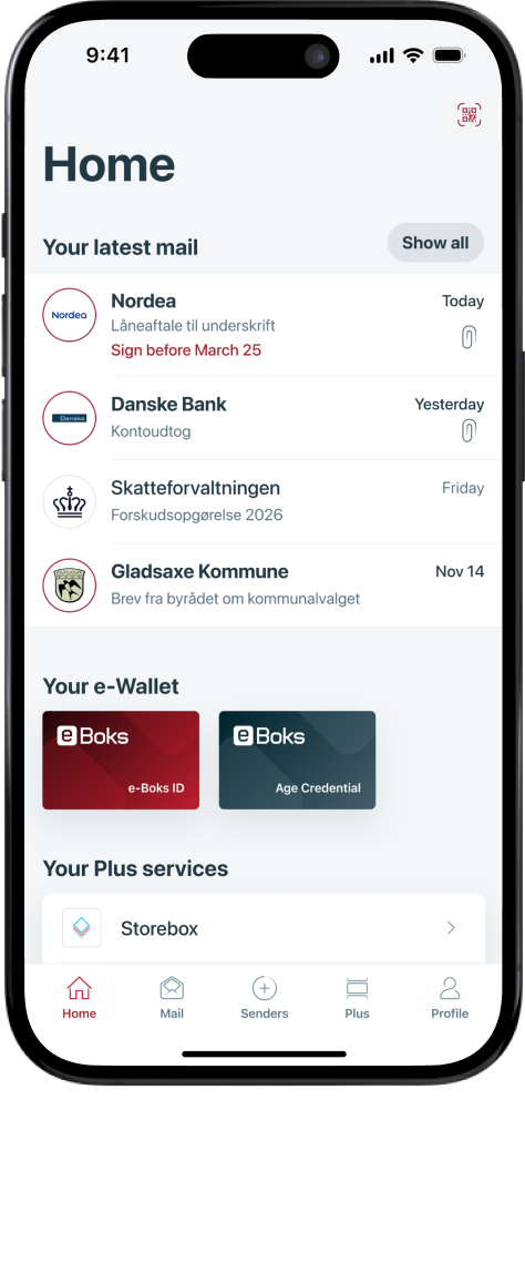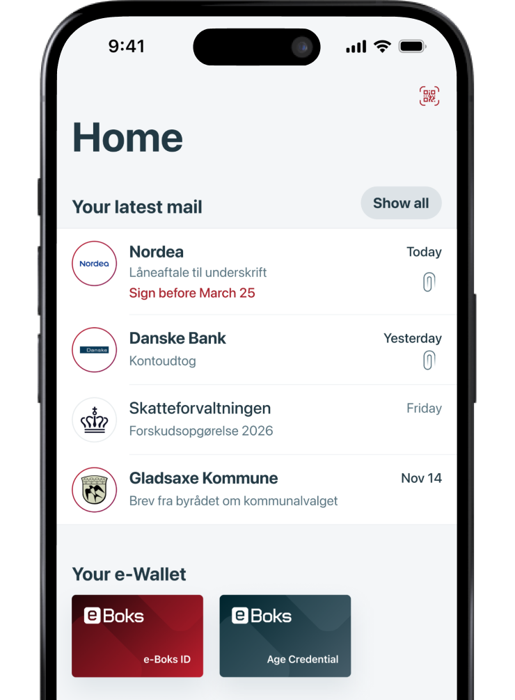 In your personal e-Wallet in the e-Boks app, you will find your e-Boks ID. Here you also have access to other digital credentials – for example a digital proof of age, which is already available.
